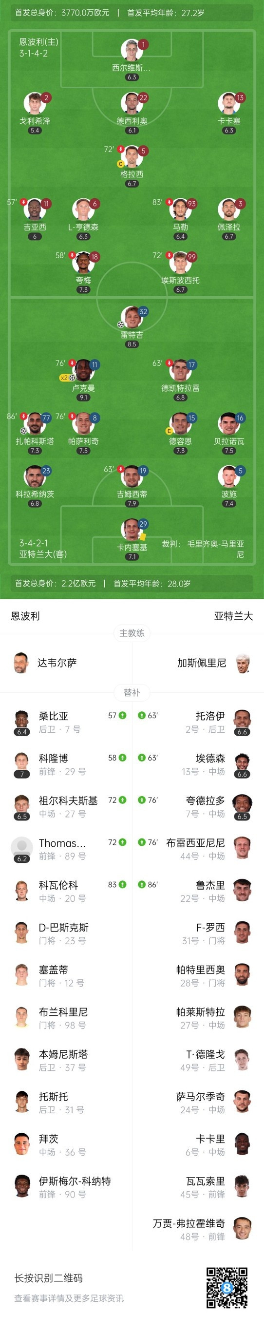 下半场补时2分钟,恩波利0-5亚特兰大。
